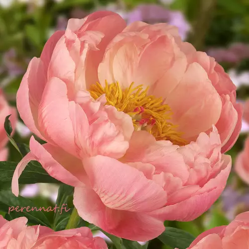 Hybridipioni Coral Charm Paeonia 'Coral Charm' A-Pv kork. 80 cm VI-VII Upeat korallinpunaiset puolikerrotut tuoksuvat kukat vaalenevat kukinnan edetessä. Keskellä kukkaa ovat kullankeltaiset heteet... Lue lisää