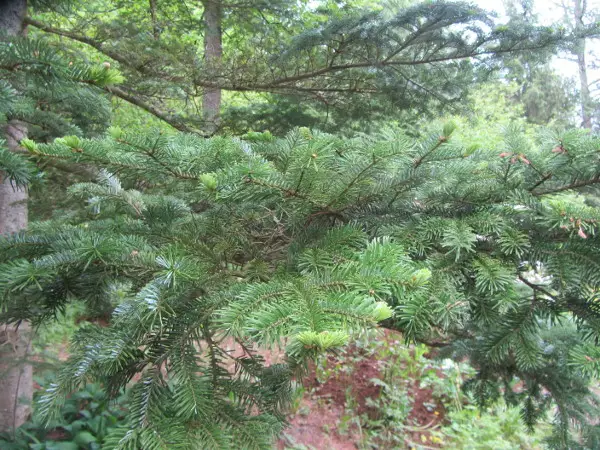 Kauniiden heleänvihreiden neulasten alapuoli näyttää lähes valkoiselta. Kävyt ovat kypsymiseen saakka sinivioletteja. Latvus on kartiomainen, oksat ovat melko lyhyitä ja vaakasuoria. Viihtyy runsasravinteisessa humuspitoisessa kasvualustassa.