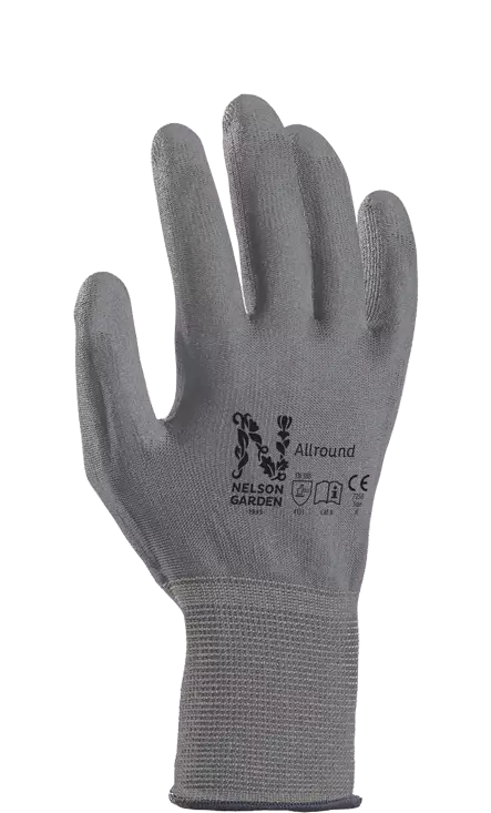 Kulutusta kestävä peruskäsine puutarhan töihin. Materiaali polyuretaanilla vahvistettua polyesteriä. Paketissa 6 paria. Käsinpesu 40 asteessa.