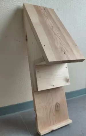 Puusta valmistettu, lepakolle mieleistä majapaikkaa muistuttava pesä. Materiaali raakalautaa jotta lepakko saa siitä hyvin kiinni kynsillään.