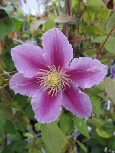 Kukat ovat vaaleanpunaiset, leveydeltään 6-12 cm, terälehden keskellä on tummempi raita. Kiertyy itse tukeen lehtiruodeillaan. Viihtyy tuoreessa, runsasravinteisessa ja kalkitussa multamaassa. Ei siedä seisovaa vettä eikä talvimärkyyttä, tyven ympärille voi laittaa hiekkaa. Juuristo suojataan kesän paahteelta istuttamalla juurelle esim. maanpeittoperennoja. Taimet istutetaan noin 20 cm syvempään.