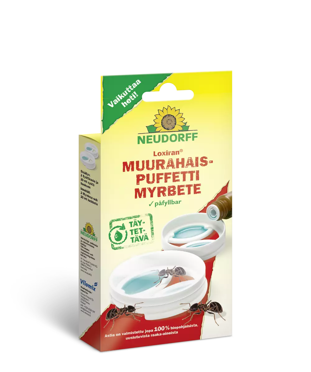 Loxiran muurahaispuffetti terasseilla, parvekkeilla ja sisätiloissa olevien muurahaisten torjuntaan.