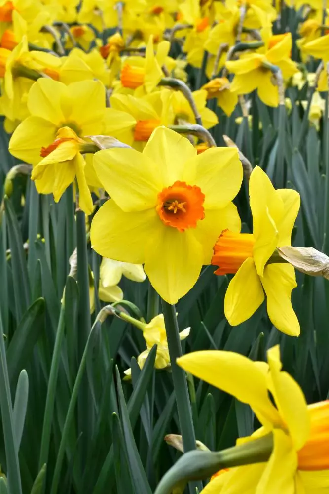 narsissi 'Red Devon' keltainen kukka punaisella torvella kukinta-aika toukokuussa korkeus 40-45 cm