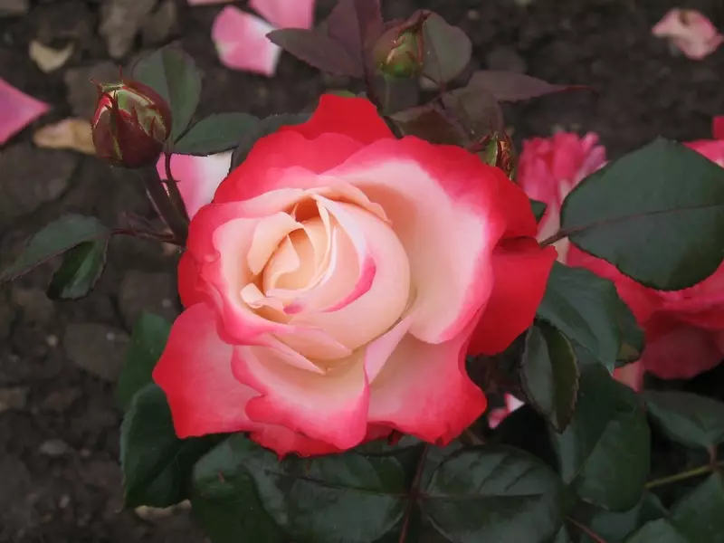 Suurikukkainen nostalgiaruusu. Kukat ovat pallomaiset, kerrotut, tuoksuvat, leveydeltään 8-10 cm. Kukka on sisäosiltaan kermanvalkoinen, reunoilta kirsikapunainen. Tuuhea kasvutapa. Nuoret lehdet ovat voimakkaan punertavia. Talvisuojaksi tyvelle kasataan reilusti talvisuojaturvetta tai hiekkapitoista multaa myöhään syksyllä. Suositus istutustiheydeksi on 6 kpl/m2.