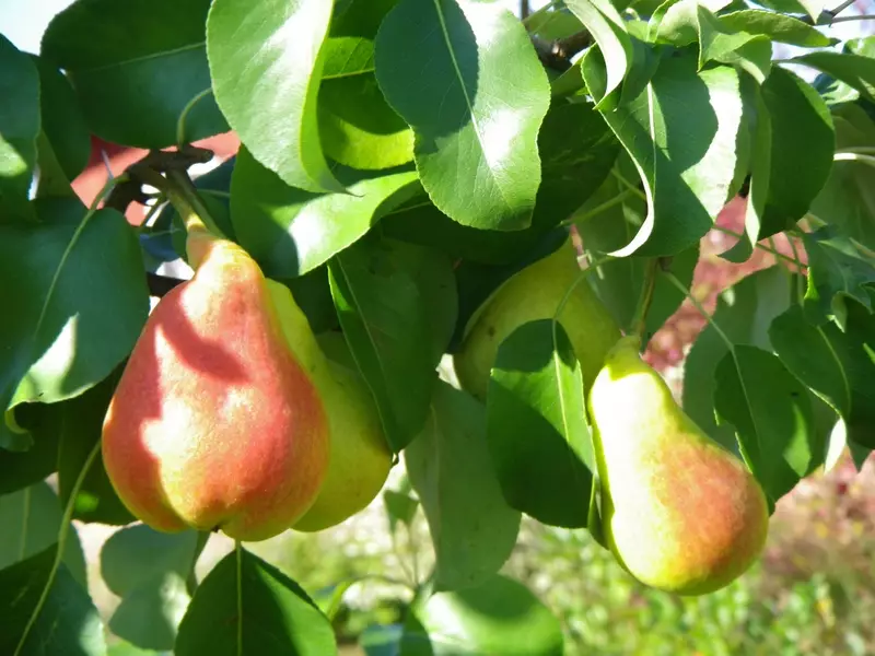 Samaan puuhun on vartettu kolme eri päärynälajiketta. Kukat pölyttävät toinen toisensa.