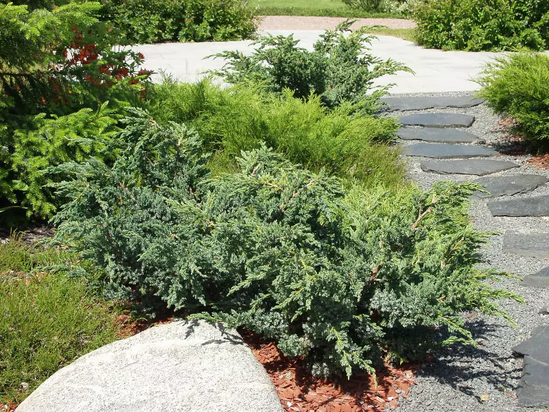 Siniharmaat neulaset. Pystyjen versojen latvat kaartuvat sivulle. Pensas on lähes yhtä korkea kuin mitä on leveä. Viihtyy kuivassa tai tuoreessa, keskiravinteisessa, vettä läpäisevässä kasvualustassa. Taimiväli 0,7-1 m.