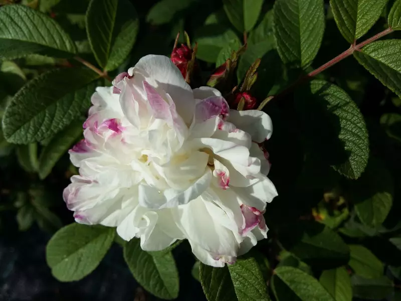 Tarhakurtturuusu ’Louise Bugnet’ Rosa Rugosa-Ryhmä I-V kork. 1,5 m/ lev. 1,5 m A-Pv Valkoisissa kukissa on joissakin terälehdissä hieman punaista, violetinpunaiset nuput. Kukkii runsaasti... Lue lisää