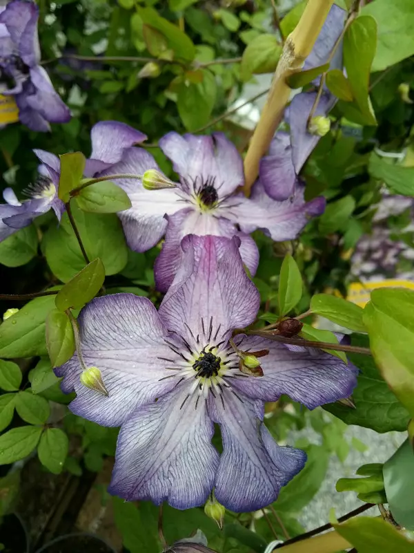 Valko-violetit kukat, joiden leveys on 5-8 cm. Kukkii heinäkuun lopulta myöhäissyksyyn. Kiertyy itse tukeen lehtiruodeillaan. Taimet istutetaan noin 20 cm syvempään kuin ruukussa.