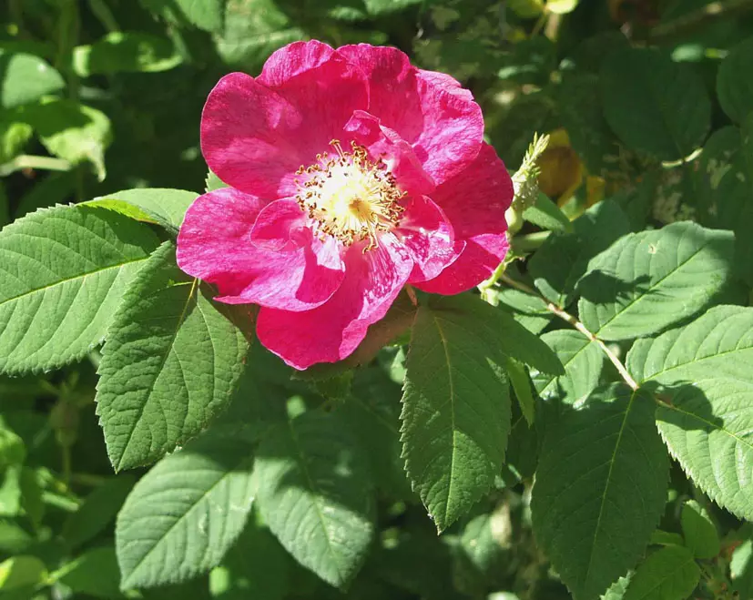 Loistavanpunaiset lähes yksinkertaiset mietotuoksuiset kukat. Kukinta alkaa heinäkuun alussa ja kestää 3 viikkoa. Pensas on kasvutavaltaan melko pystykasvuinen, juurivesoja muodostuu kohtalaisen runsaasti. Kukat muodostuvat edellisen vuoden versoihin, kukkivissa haaroissa on vain vähän piikkejä. Hieno keltainen syysväri. Päärynänmuotoiset kiulukat ehtivät vain harvoin kypsyä punaisiksi. Melko vaatimaton maan laadun suhteen. Suosii kuivahkoa tai tuoretta, multavaa, keskiravinteista ja kalkittua kasvualustaa. Taimiväli on 80-100 cm.